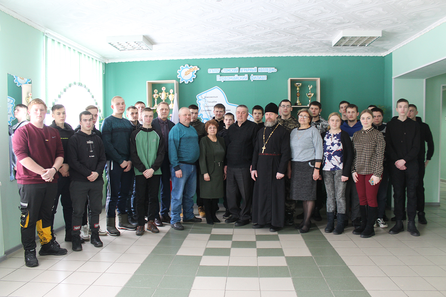 Первомайский филиал Томского аграрного колледжа принимал гостей. По инициативе районного совета ветеранов здесь состоялся Урок мужества с участием ветеранов МВД, настоятеля прихода Свято-Троицкого храма Владимира Лукьяненко и заместителя председателя районного совета ветеранов В.М. Тимофеевой. Студенты, будущие солдаты-срочники Российской армии, услышали воспоминания о службе в Вооружённых силах СССР.