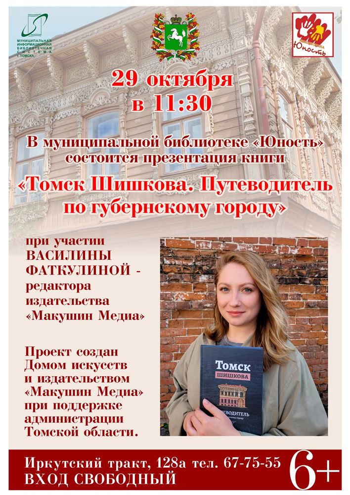 29 октября в 11-30 в библиотеке « Юность » (Иркутский тракт, 128а) в рамках книжного клуба состоится презентация путеводителя «Томск Шишкова. Путеводитель по губернскому городу» , который представит Василина Фаткулина - редактор издательства "Макушин Медиа".