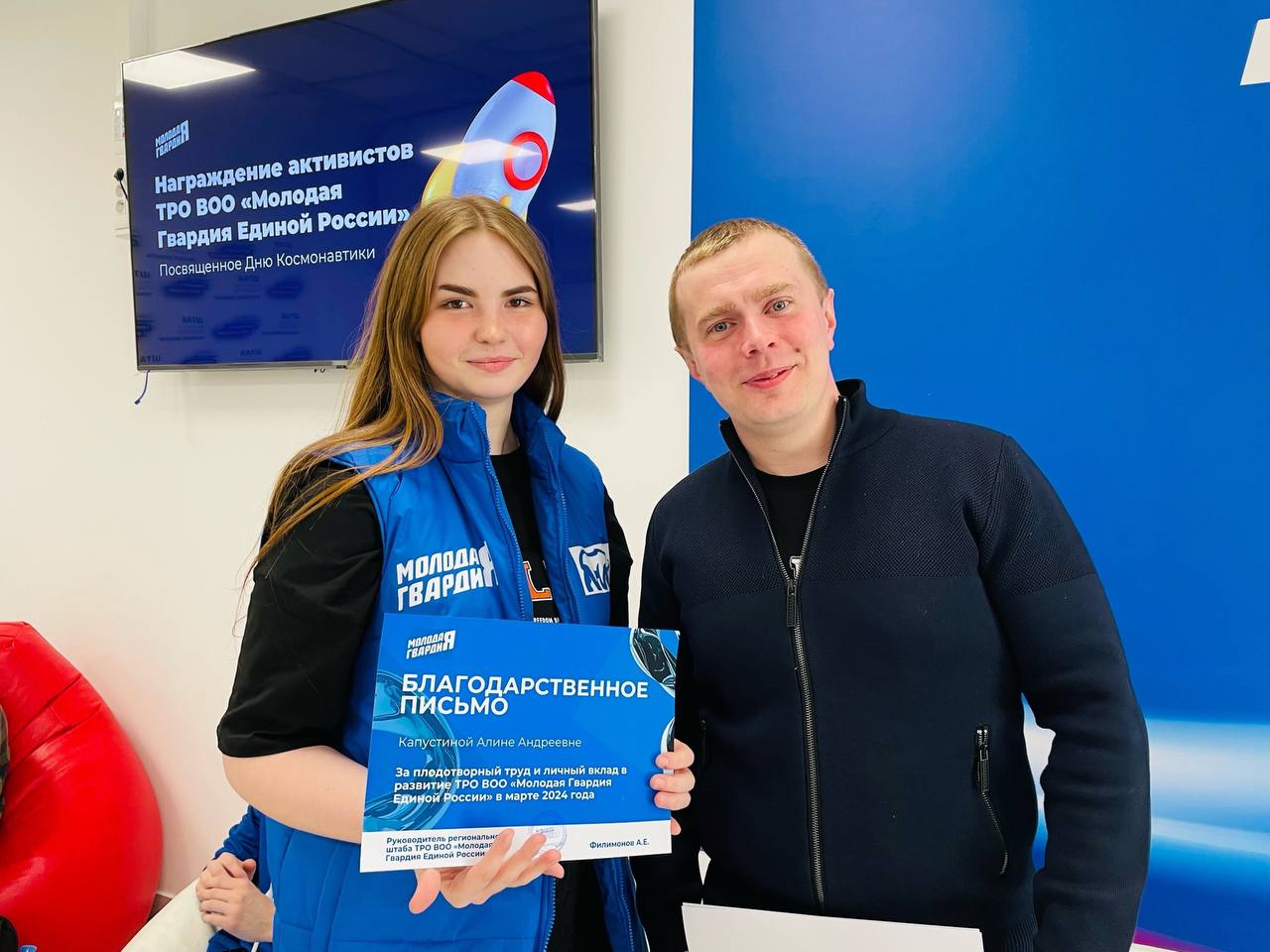 Активисты «Молодой Гвардии Единой России» были награждены благодарственными письмами за активную гражданскую позицию, участие в гражданско-патриотическом воспитании молодёжи и популяризацию добровольческой деятельности.