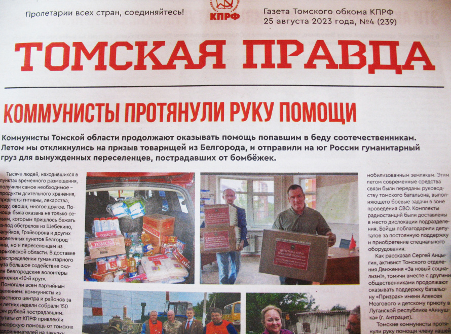 Выпуск за август подвёл некоторые итоги работы коммунистов региона этим летом. Так, номер открывает материал «Коммунисты протянули руку помощи», рассказывающий о благотворительных акциях членов партии. В частности, был собран и доставлен гуманитарный груз для жителей Белгородской области, пострадавших от бомбёжек. Кроме того, депутаты-коммунисты постоянно оказывают помощь мобилизованным на СВО землякам. Сообщается и о других добрых делах членов партии.