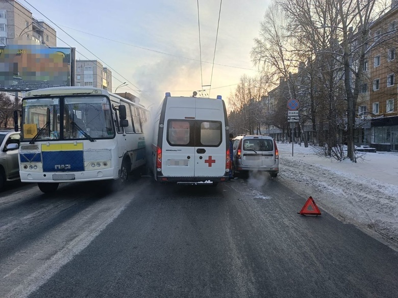 На регулируемом перекрестке проспекта Ленина с улицей Учебной произошло столкновение трех транспортных средств — маршрутного автобуса ПАЗ, автомобиля скорой помощи и легкового автомобиля Lada.
