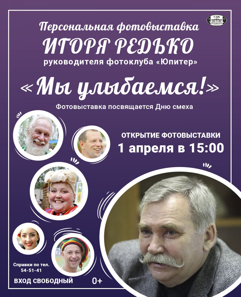 Желая порадовать северчан, Городской дом культуры им.Н.Островского открывает в выставочном зале персональную выставку руководителя фотоклуба «Юпитер» Игоря Редько под названием «Мы улыбаемся!». В экспозиции представлена коллекция улыбок, пойманных объективом фотографа в неожиданные для человека моменты, которые обязательно вызовут ответную улыбку и оставят светлые впечатления.