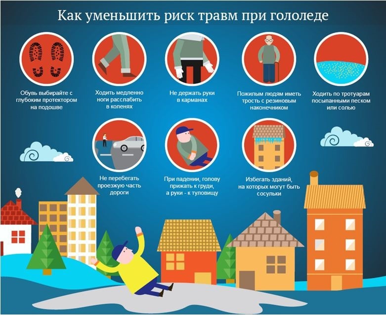 В связи с перепадами температуры возможны гололедные явления на тротуарах и дорогах. Травматизм в это время, как правило, обусловлен падениями, которые могут привести к серьезным последствиям: от вывихов и переломов до сотрясения головного мозга.
