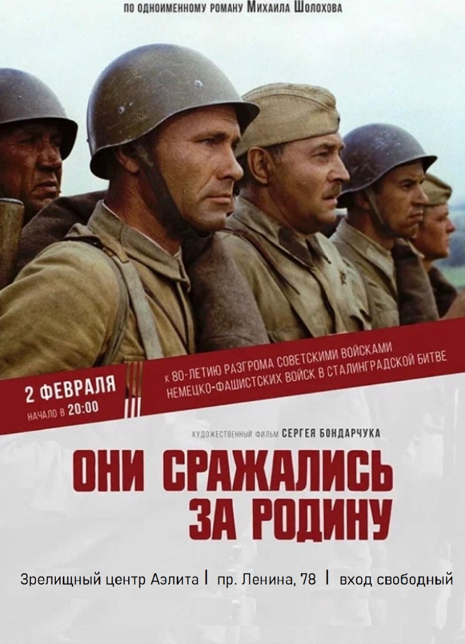 В четверг, 2 февраля, в 20.00 в зрелищном центре «Аэлита» (пр. Ленина, 78) состоится бесплатный кинопоказ советского фильма «Они сражались за Родину».