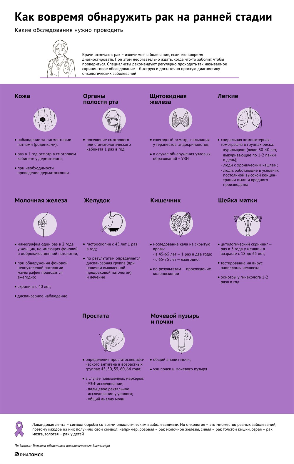 Заболеваемость раком растет в Томской области. Врачи-онкологи постоянно напоминают: ранняя диагностика повышает шансы на успешное лечение онкологических заболеваний. Какие обследования рекомендуют проводить врачи и как часто к ним следует обращаться, в инфографике РИА Томск.© РИА Томск. Лариса Лавникович
